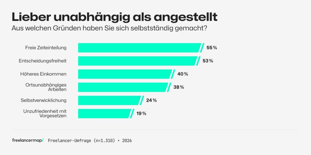 Die Motive für den Schritt in die Selbstständigkeit sind dabei klar: 55 Prozent der Befragten nennen die freie Zeiteinteilung als Hauptgrund, 53 Prozent die Entscheidungsfreiheit. Für 40 Prozent spielt ein höheres Einkommen eine Rolle, 38 Prozent schätzen die Ortsunabhängigkeit. Ein Viertel sieht in der Selbstverwirklichung den entscheidenden Antrieb — und 19 Prozent haben sich bewusst aus Unzufriedenheit mit Vorgesetzten oder Unternehmensstrukturen selbstständig gemacht.